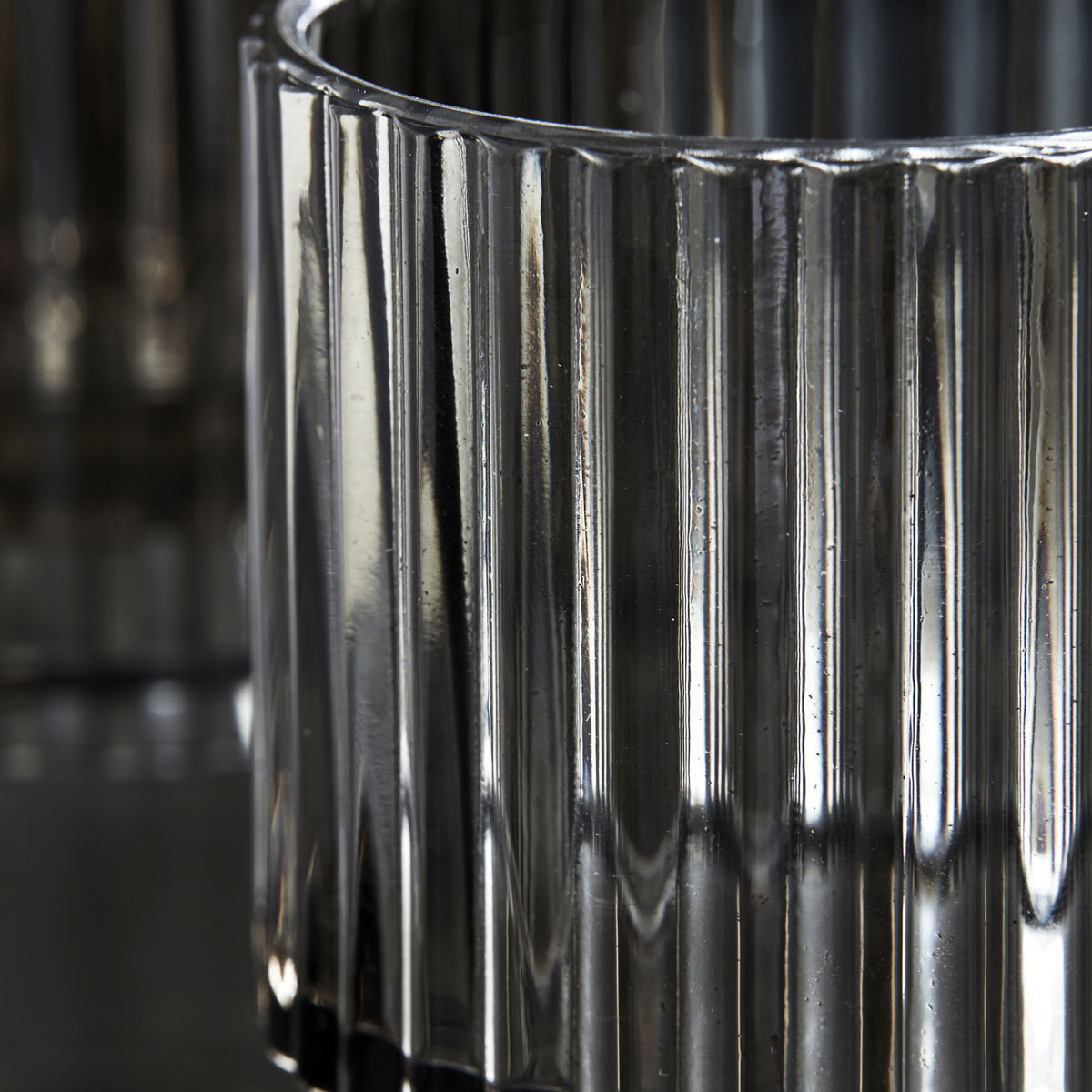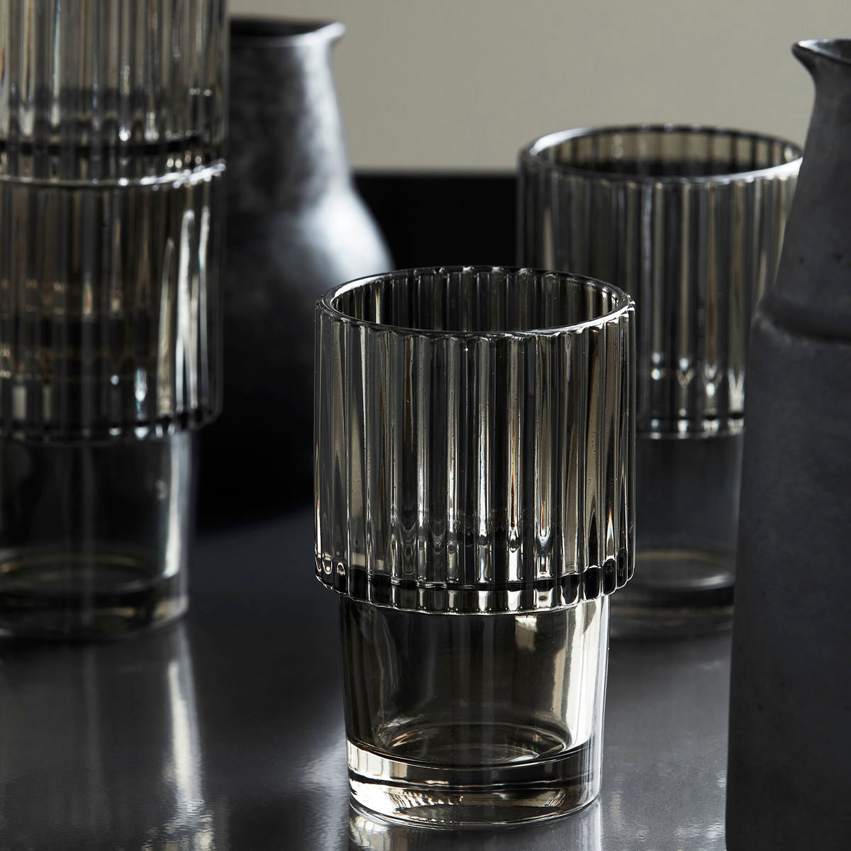 In StockIn StockOut of stockGlass tumblers with a timeless appeal. This set of 4 Rills glasses from House Doctor come in a versatile smoked grey colour that provides an easy update to your table setting. A step up from your everyday, clear tumblers. The glasses are stackable thanks to the narrow bottom and can hold 370 ml each. The upper part is a bit wider and fluted, giving the glasses a nice shape and texture. Drinking glasses dont have to be boring. If you are going to use them daily, why not opt for solid glasses like Rills that are all about everyday elegance. They can be used for both hot and cold beverages.